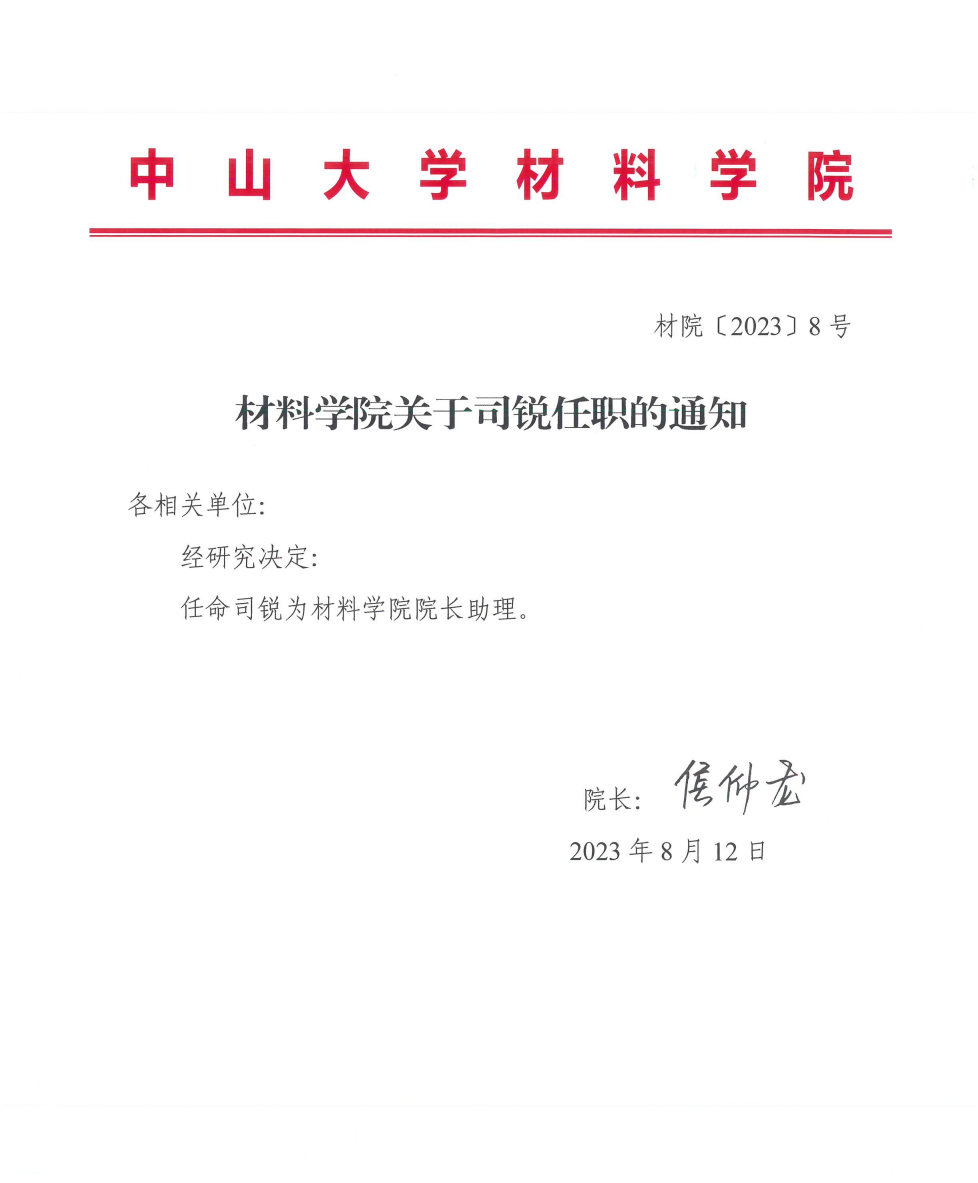 材料学院关于司锐任职的通知