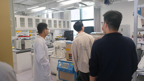 蒋文涵副书记和院长助理司锐教授带领大家参观了由深圳综合粒子设施研究院研制的硬X射线衍射装置,目前该装置已处于试运行阶段,可为广大新能源二次电池、催化、材料等领域提供具有秒级时间分辨能力的原位实验,研究电化学、催化、材料合成及加工过程中的动态变化过程,提高研究成果的结论可靠性。